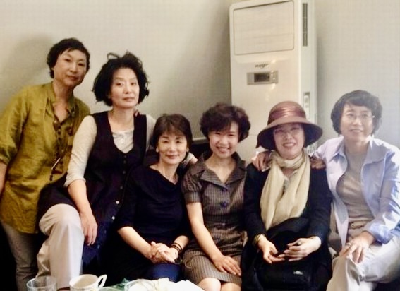 칭구 김태연이와 서울미대 동창들의 "서울-봄" 전시회에서 칭구들과 함께- 카페 갤러리 봄에서 아쉽게도 내가 그날 사진을 찍지 않아서 이번 전시회 태연이 그림이 없다. 그의 그림의 주제는 늘 연꽃이다. 더러움에 물들지 않는 꽃. 시시각각 변하는 연꽃을 주제로 한 그의 그림에는 늘 동반자가 있다. 새와, 물고기.