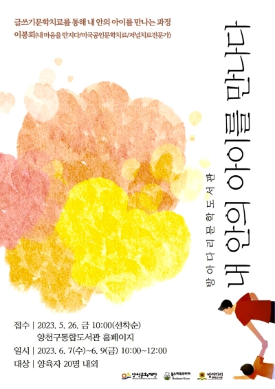 ❍ 아이를 양육하는 양육자에게 도움이 되고 양육자 자신도 치유받는 글쓰기치료 실습이 포함됩니다. (실습 중 쓰는 글을 비밀이 보장됩니다.) ❍ 프로그램 내용: 1)당신 모습 그대로 오십시오 2)내면 가족, 내면 아이 3)엄마의 기대가 나를 아프게 해요 ❍ 프로그램 내용은 참여자 분들과의 상호작용에 따라 변경될 수 있습니다. ----------------- 아이들은 정말 삶에서 가장 놀라운 축복중 하나입니다. 축복인 이유는 당연히 그 놀라운 생명의 탄생과 성장을 함께하는 기적 같은 시간들 때문이지요. 어떤 것도 당연한 것이 없는 힘겹고도 아름다운 생명의 성장을 바라보는 경이로움 때문입니다.