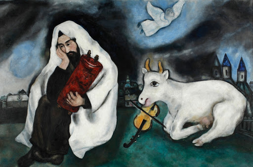 그 옆에 누워 있는 슬프고 순한 눈을 한 암소는 외로운 주인을 위해 음악이라도 연주하려는 것일까?  어떤 이는 이 장면이 호세아의 말을 상기시킨다고 한다-- "이스라엘은 뒤로 미끄러지는 암소처럼 뒤로 미끄러진다."(호세아 4:16) 이들은 디아스포라의 유대인들, 샤갈의 사람들을 상징한다.